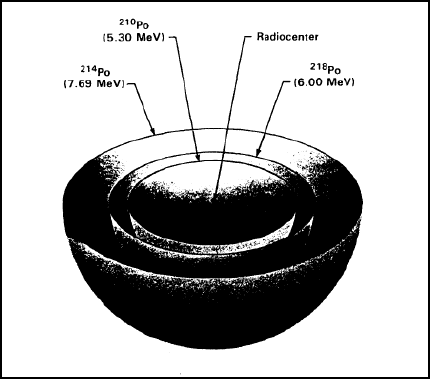 the many concentric rings a halve made by it and its daughter products. Each halo ring is