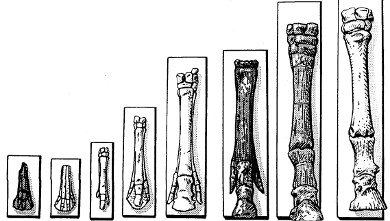 exhibit we see a small, three-toed animal that grows larger and becomes