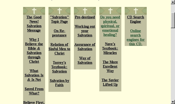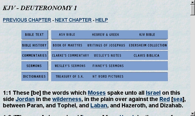 This map includes the first four genres listed in paragraph one above. Click one of the book links, browse through the page, and click the back button on the Browser. Now, scroll down the Bible chapter, past the picture map. The Bible chapter text should now be visible. Within this text there are links on many key words. These links throughout the text represent the fifth category that I mentioned above. Click on one of the text links.