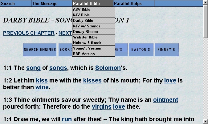 Scroll down the page and find a chapter that interests you, and click its link. The chapter of the Bible you chose should be visible with a toolbar at the top of the browser screen. The toolbar is your connection to the Parallel Bible and its helps. Move the cursor over the Bible category on the toolbar. Notice a list of all the parallel Bibles appears.