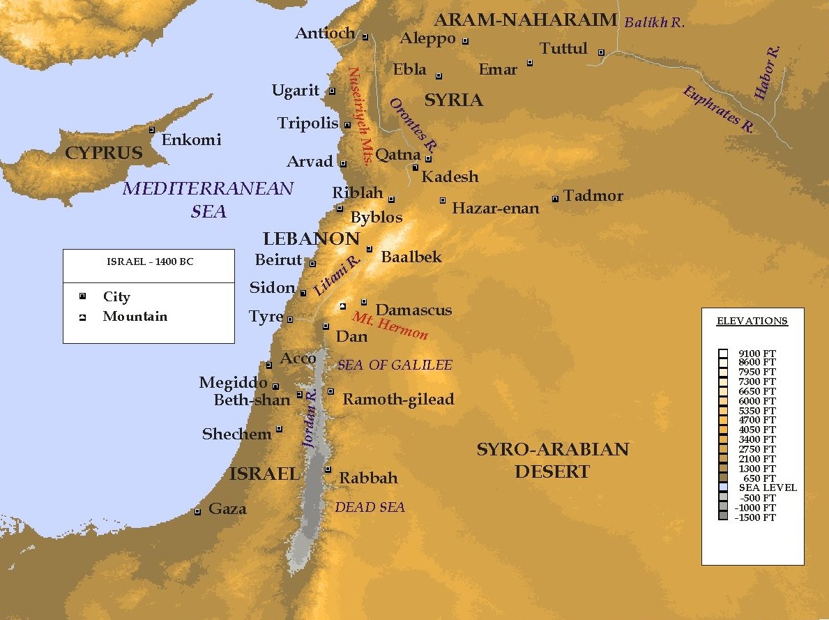 Israel during the time surrounding Amenhotep III. (Note - The topographical information represented in this picture was derived from NASA's GTOP030. GTOP030 is a digital elevation model (DEM) created from several raster and vector topographical sources.) |