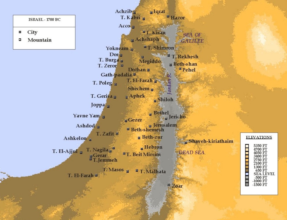 The land of Israel during the time of Joseph. (Note - The topographical information represented in this picture was derived from NASA's GTOP030. GTOP030 is a digital elevation model (DEM) created from several raster and vector topographical sources.) |