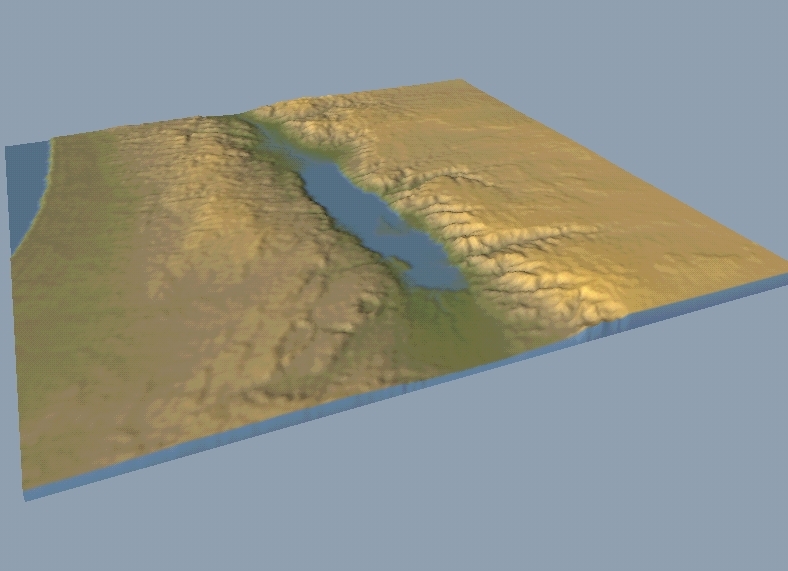 A 3D view of the Dead Sea. (Note - The topographical information represented in this picture was derived from NASA's GTOP030. GTOP030 is a digital elevation model (DEM) created from several raster and vector topographical sources.) |
