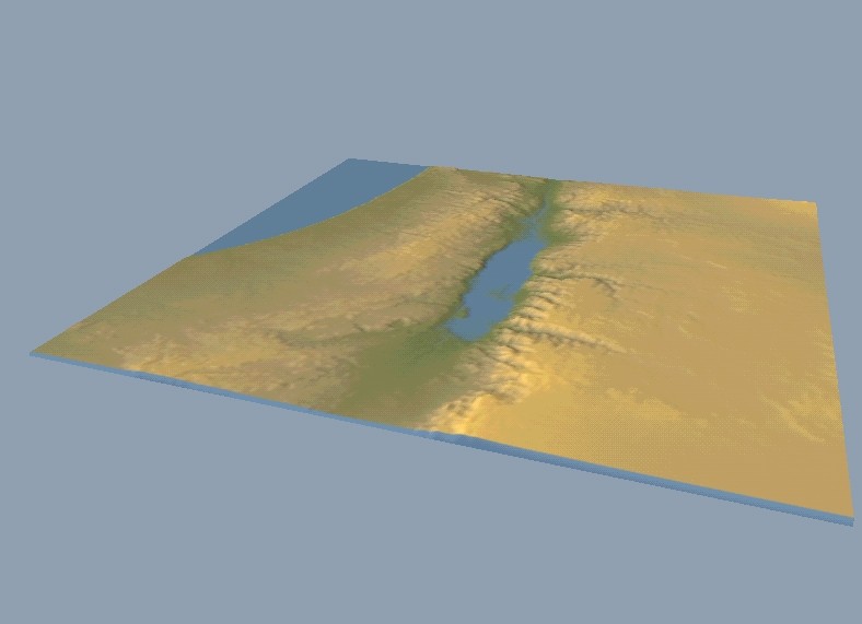 A 3D view of Israel. (Note - The topographical information represented in this picture was derived from NASA's GTOP030. GTOP030 is a digital elevation model (DEM) created from several raster and vector topographical sources.) |
