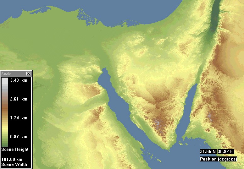 A topographical view of Egypt. (Note - The topographical information represented in this picture was derived from NASA's GTOP030. GTOP030 is a digital elevation model (DEM) created from several raster and vector topographical sources.) |