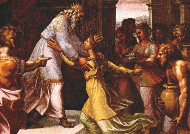 1 Kings 10:1,4,10,13. 2 Chronicles 9:1,2,3,9,10,12,13,14,15,20,22,23,25,28,29,30,31. The Queen of Sheba offering King Solomon a welcoming gift.