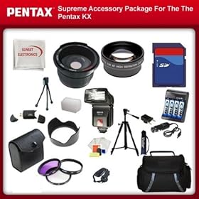 Supreme Accessory Package For Pentax KX Digital Camera, includes: 16GB SD Card, SD Card Reader, 4 AA Batteries & Charger, Lens Hood, 0.5x Wide Angle Lens , 2X Telephoto Lens, 57 Inch tripod, Swivel TTL Flash, Flash Diffuser and More...THIS LENS WILL ATTACH TO ANY OF THE FOLLOWING PENTAX LENSES 18-55mm, 50-200mm: Camera & Photo