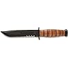 KA-BAR Full Size US Marine Corp Fighting Knife, Straight: Sports & Outdoors. If the knife fails to satisfy this limited warranty, the company will repair or replace the knife or substitute a knife of comparable value, at the company's option. Originally manufactured for American troops fighting in World War II, this KA-BAR full-size hunting knife sports a leather handle and a 7-inch straight-edge blade made with 1095 cro-van steel. The knife features a U.S. Marine Corp. stamp and was made in the United States. Also included is a leather sheath made in Mexico. Specifications: Weight: 0.70 pounds Blade length: 7 inches Overall length: 11 7/8 inches Shape: Clip Stamp: USMC Edge angle: 20 degrees Steel: 1095 Cro-Van Grind: Flat Handle material: Leather How KA-BAR Knives Are Made Making a quality KA-BAR product requires the talent of experienced craftspeople performing dozens of processes with precision and skill. Each knife undergoes specific manufacturing processes to ensure corrosion resistance, strength, edge-holding ability, and an out-of-the-box, razor-sharp cutting edge. Some of these manufacturing processes are highlighted below. Blanking: Using a 100-ton blanking press, KA-BAR can blank out nearly 9,000 blades in one full day of operation. Tang Stamping: Tang stamping is often used to identify a product's manufacturer, the country in which the product was made, and an item number. Heat Treating: To begin the three-step heat-treat process of stainless-steel blades, KA-BAR first runs the blades through a 70-foot conveyor oven that takes approximately one hour to cycle. Cryogenic Quenching: The second step in a three-phrase heat-treat process, KA-BAR cryogenically freezes its stainless-steel blades to -120 degrees F to optimize blade performance. Tempering: Tempering stainless-steel blades for approximately seven hours in a walk-in oven enhances steel toughness. KA-BAR is well known for its three-phase heat-treat process in which tempering is the last step. Grinding: KA-BAR knives feature flat- or hollow-ground blades. Flat grinds are best for jobs in which there will be great lateral stress. Hollow grinds provide a fine, extremely sharp edge that is perfect for more delicate tasks. Leather Handle Compression: KA-BAR's famous oval-shaped leather handle construction is accomplished by compressing leather washers onto the tang, shaping and coloring them, and then fastening them on with a pinned-on butt cap. Cap/Pin Assembly: The butt cap or pommel is attached to the handle of a knife with a steel pin. The pin is inserted into the butt cap, driven part way through the tang, then ground off and painted. Inspection: Each KA-BAR knife is subject to a multiple-step inspection process before being released for shipping. Manufacturer's Warranty KA-BAR Knives warrants, to the original purchaser of the knife only, that this knife will be free from defects in material and craftsmanship under normal use and maintenance for the lifetime of the original purchaser. This limited warranty does not apply to any failure of, defect in, or damage to the knife caused by normal wear and tear or by improper use, including throwing the knife or using the blades as a can opener, chisel, pry bar, screwdriver, or digging tool or for any heavy work for which the knife was not designed. About KA-BAR Knives KA-BAR Knives, a subsidiary of Alcas Corporation, manufactures high quality military, hunting, sporting, and all-purpose utility knives.