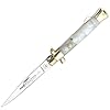 Kissing Crane Black Composite Stiletto Folding Knife: Sports & Outdoors. 4 3/4 inch closed. We know you like stilettos, but you've never seen one this nice. The all-new Kissing Crane Black Stiletto features a classy black composite handle and brass plated pins, bolsters and a brass Kissing Crane cast shield on the handle. It even has a 4 inch mirror polished stainless steel blade with a Kissing Crane Stiletto etched right onto the blade. It's just what you need for elegant looks and great protection. 8 3/4 inch overall.