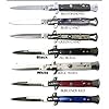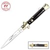 Kissing Crane Mother of Pearl Stiletto Folding Knife: Sports & Outdoors. 4 3/4 inch closed. We know you like stilettos, but you've never seen one this nice. The all-new Kissing Crane Mother of Pearl Stiletto features a classy mother of pearl handle and brass plated pins, bolsters and a brass Kissing Crane cast shield on the handle. It even has a 4 inch mirror polished stainless steel blade with a Kissing Crane Stiletto etched right onto the blade. It's just what you need for elegant looks and great protection. 8 3/4 inch overall.