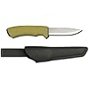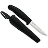 Mora Utility Knife: Sports & Outdoors. The handle is about 4 3/8 inch long, and sized for average and smaller hands. Hard red plastic handle and a substantial guard. The carbon steel blade is just under 3 3/4.