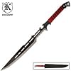 Red Guardian 28 Inch Sword with Sheath: Sports & Outdoors. The blade features fantasy cut outs, teeth like serrations, and a piercing point, and slides smoothly into the included nylon blade sheath. Sleek, dangerous, tactical! Measuring 28 inch overall, this sword is one solid piece of cold hard, stainless steel with a heat-treated black baked finish. The red simulated leather wrapped handle adds a sure grip for easy maneuverability.