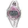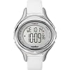 Timex Womens T5K377 Ironman Sleek 50-Lap Floral Digital Watch: Timex: Watches. Protected by a resin bezel and case along with a durable, acrylic window, the dial features a subtle, floral pattern for a soft, pretty look. Ideal for runners, swimmers, and sports enthusiasts, the Timex Women's Ironman Sleek 50-Lap Floral Digital Watch offers full functionality with a floral touch. The easy-to-read, digital dial features multiple functions such as a100-hour chronograph with lap or split times, 50-lap memory recall, 99-lap counter, and two interval timers. There are also three customizable alarms ideal for busy women along with an Indiglo night-light for dim conditions. Two pushers on each side and a large start/split button on the front offer easy access to all of the watch's functions. The two-tone, white and silver watch strap features an aerodynamic design that molds to the curves of your wrist.