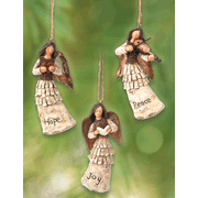 Trio of Christmas angels in rustic detailing, each engraved with a Christmas sentiment Hope, Peace, Joy; crafted of resin with the look and feel of handcarved wood, each praising with open wings and musical details; twine loop for hanging on your tree or in a window. Set of three angels included; each is approximately 3.75" tall; created exclusively for the Gift Collection at Christianbook.com.