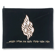 Matching tallit bag is fashioned of soft black velour with metallic gold embroidered flame design and Hebrew text. Zipper closure; measures 13.5" x 10.5".