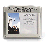 Easel-backed desktop motivator holds 30 full-color cards, each featuring an inspiring photograph and relevant verse on the front, and a life-application meditation on the back. Measures 4" x 3". Brushed pewter, engraved For the Graduate, Jeremiah 29:11.