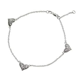 10 K White Gold 9" Belcher Style 3 White Stone Heart Charm Anklet: Jewelry