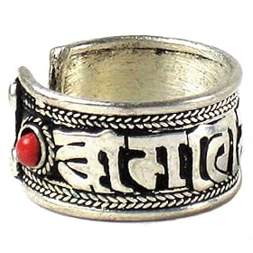 "OM MANI PADME HUM" Mantra Ring ~ White Metal w/ Red Ornaments ~ Includes Om Mani Ring Pouch: Home & Kitchen