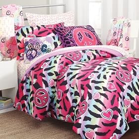 Girl Pink Purple Lime Green Teal Peace Sign Queen Comforter Set (8pc Bed in a Bag): Home & Kitchen