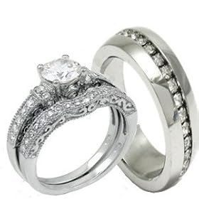 3 Pieces His & Hers, Men"s TITANIUM & Women"s Rhodium plated STERLING SILVER Engagement Wedding Bridal Ring Set (Size Men"s 10 Women"s 7): Jewelry