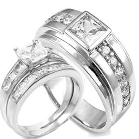 His & Hers 3 Pieces, 925 Sterling Silver & Stainless Steel Engagement Wedding Ring Set, AVAILABLE SIZES men"s 8,9,10,11,12; women"s set: 5,6,7,8,9.: Jewelry