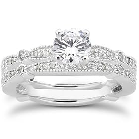 Real .95CT Pave Diamond Matching Engagement Wedding Ring Set Vintage Milgrain: Jewelry
