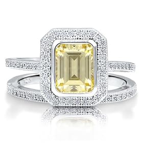 Sterling Silver 925 Emerald Cut Canary Cubic Zirconia CZ Halo Ring Set - Nickel Free Engagement Wedding Ring Set Size 5: Jewelry