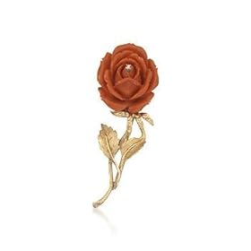C. 1960 Vintage Carved Coral Flower Pin, Diamond In 14kt Yellow Gold: Jewelry