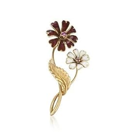 C. 1960 Vintage Unoaerre .20ct t.w. Ruby Floral Pin, Enamel In Gold: Jewelry