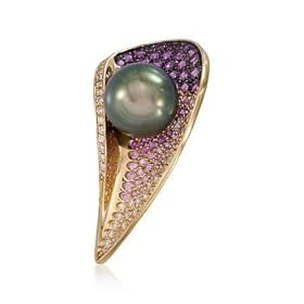 C. 1990 Vintage Schoefel Black South Sea Pearl, Multi-Gem Pin In Gold: Jewelry