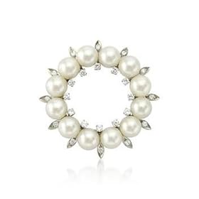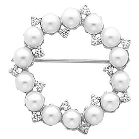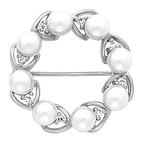 14K White Gold Pearl and Diamond Circle Brooch: Jewelry