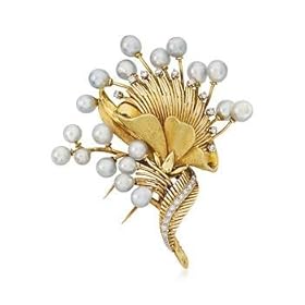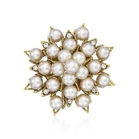 14K Yellow Gold Akoya Cultured Pearl and Diamond Brooch: Jewelry