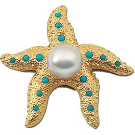 18K Yellow Gold Paspaley South Sea Cultured Fine Flat Button Pearl and Turquoise Starfish Brooch: Jewelry