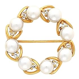 14K Yellow Gold White Akoya Pearl and Diamond Circle Brooch: Jewelry