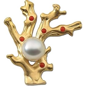 18K Yellow Gold Paspaley South Sea Cultured Fine Flat Bottom Pearl and Coral Brooch: Jewelry