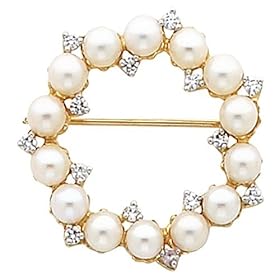 14K Yellow Gold Pearl and Diamond Circle Brooch: Jewelry