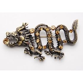 Vintage Inspired Reproduction Dragon Brass Tone Brooch Pin Topaz Fashion Crystal: Jewelry