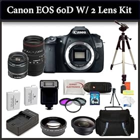 Canon EOS 60D DSLR Camera Kit Includes: Canon EOS 60D Digital Camera with 18-55mm Lens, Sigma 70-300mm f/4-5.6 APO-M DG Macro Lens, 0.45 Wide Angle Lens, 2x Telephoto Lens, 2 extended Life Batteries, Rapid Travel Charger, Full Size Tripod, 3 Piece Filter Kit(UV-CPl-FLD), Flash, 8GB Memory Card, Memory Card Reader, Cleaning Kit with SSE Microfiber Cleaning Cloth, Table Top Tripod, LCD Screen Protectors and Soft Carrying Case: Camera & Photo