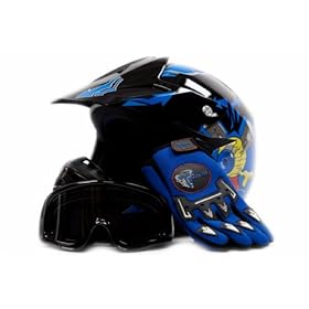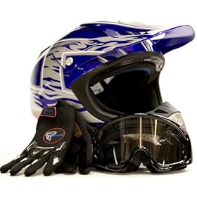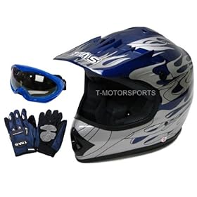 TMS Youth Blue Flame ATV Dirt Bike Motocross Helmet with Goggles and Gloves (Large): Automotive