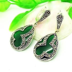 Sterling Silver Marcasite and Agate Red or Green or Black Color Earrings Jewelry 8.7g 39mmx17mm: Kitchen & Dining