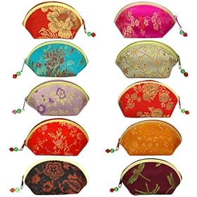 Silk Embroidered Brocade Oriental Fan Zipper Jewelry Coin Pouch Wallet Set of 10 - Various Colors: Dahlia: Jewelry