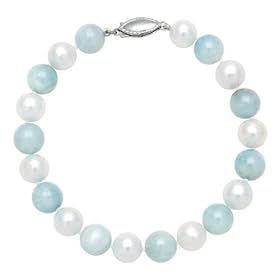 7.5 Inch 8mm Round White Freshwater Pearl and Aquamarine Stone Bracelet in Sterling Silver: Pearlzzz: Jewelry