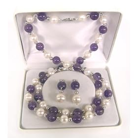 8-10mm White Freshwater Pearl, Amethyst, and Sterling Silver Bead Necklace, Bracelet, and Stud Earring Set: Pearlzzz: Jewelry