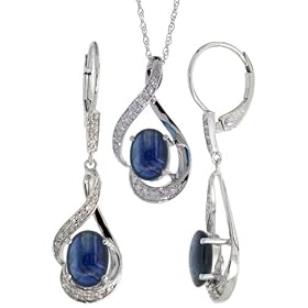14k White Gold Dangle Earrings (19mm tall) & 18 in. Pendant-Necklace Set, w/ 0.20 Carat Brilliant Cut Diamonds & 3.64 Carats Oval Cut (7x5mm) Blue Sapphire Stones: Jewelry