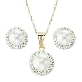 10k Yellow Gold Freshwater Cultured Pearl and Crystal Earrings 5.7mm and Pendant 7mm Set,18": Jewelry
