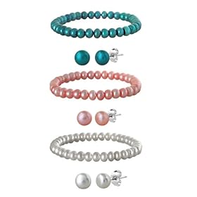 6-7mm Freshwater Cultured Teal Blue, Blush Rose and White Button Pearl Stretch Bracelet and Sterling Silver Stud Earrings 6 Piece Set, 7.5": Jewelry