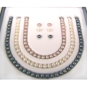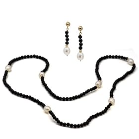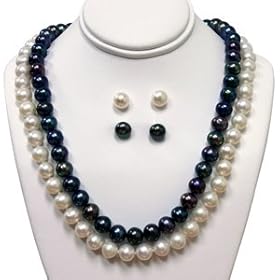 7-8mm Black & White Freshwater Pearl, 2-Necklace and 2-Stud Earring Set with 14K Yellow Gold in Gift Box: Pearlzzz: Jewelry