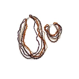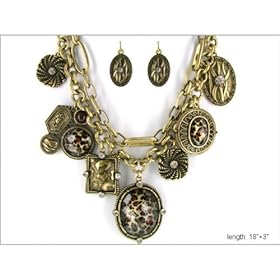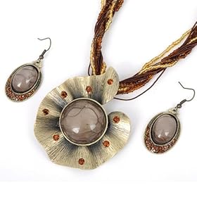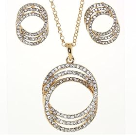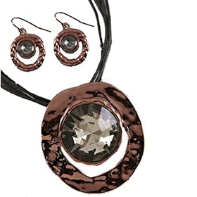 Fashion Necklace and Earring Set with Bronze Plated Multi Strand Necklace with Large Clear Crystal In Center and Round Hoop Earrings: Jewelry