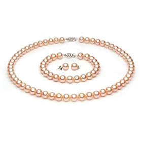 14k Yellow Gold 7-8mm Pink Freshwater Cultured Pearl Set AAA Quality, Set Includes Necklace, Bracelet, & Earrings: Jewelry