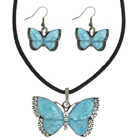 Ladies Light Blue Enamel Butterfly Necklace and Butterfly Earring Set - Adorned with Crystals and Adjustable Cord: Jewelry